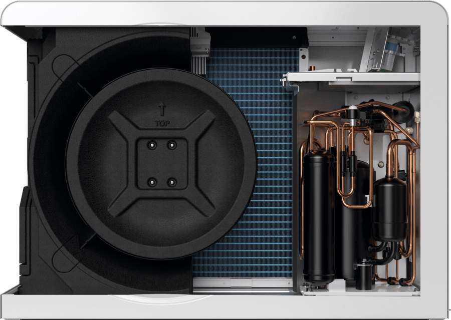Tower-Variante der Compress 5800i AW mit integriertem 180-Liter-Warmwasser- und einem 16-Liter-Pufferspeicher. Vorteil: schnelle Installation auf nur 0,36 m² Aufstellfläche. Damit ist sie ideal für den Einsatz im Neubau.